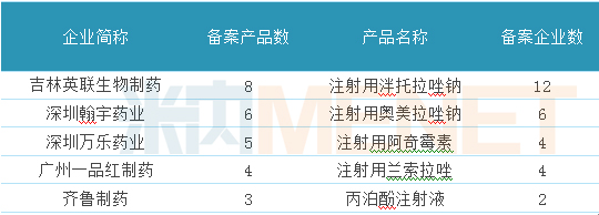 表2:注射劑一致性評價參比制劑備案企業(yè)及產品TOP5
