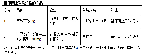 本次通知暫停網(wǎng)上采購資格的產(chǎn)品有山東仙河藥業(yè)的蒙脫石散、安徽貝克生物制藥的富馬酸替諾福韋二吡呋酯片 。