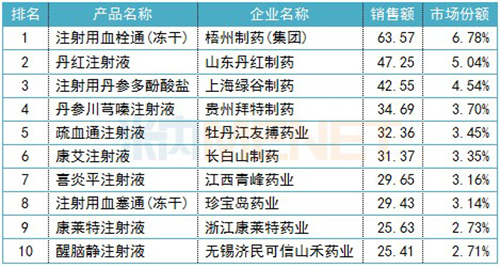 品牌TOP10銷售額均超過(guò)25億元,其中,梧州制藥(集團(tuán))的注射用血栓通(凍干)、山東丹紅制藥的丹紅注射液等7個(gè)是獨(dú)家品種。