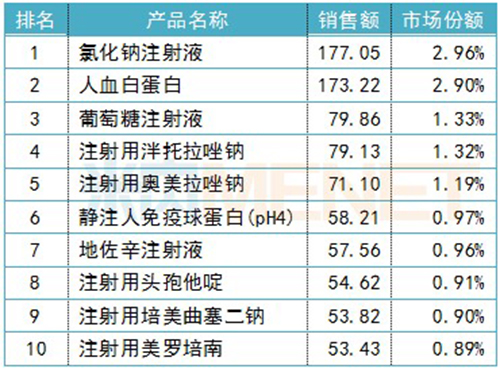 2018年中國(guó)公立醫(yī)療機(jī)構(gòu)終端化藥注射劑產(chǎn)品TOP10(單位:億元)