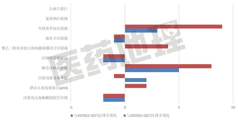 基于PDB國內(nèi)樣本醫(yī)院市場數(shù)據(jù),2021年前三季度最為暢銷的10個產(chǎn)品如圖所示,全部都是注射給藥。相較于2020年和2019年同期,人血白蛋白和氯化鈉注射液的地位極其穩(wěn)定;聚乙二醇化重組人粒細胞刺激因子注射液和靜注人免疫球蛋白(pH4)的排名相較于2020年同期無任何變化;地佐辛注射液、注射用美羅培南和注射用頭孢哌酮鈉舒巴坦鈉的排名下滑明顯;排名上升比較快的是貝伐珠單抗注射液和碘克沙醇注射液。