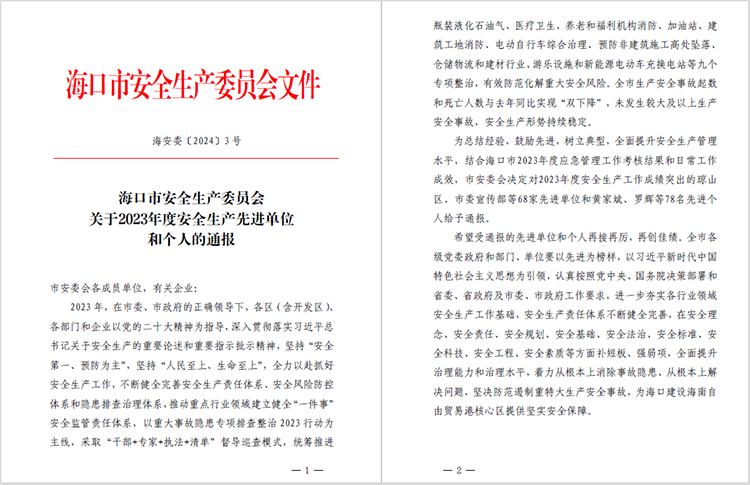 喜報!公司獲評??谑邪踩a(chǎn)委員會2023年度安全生產(chǎn)先進(jìn)單位