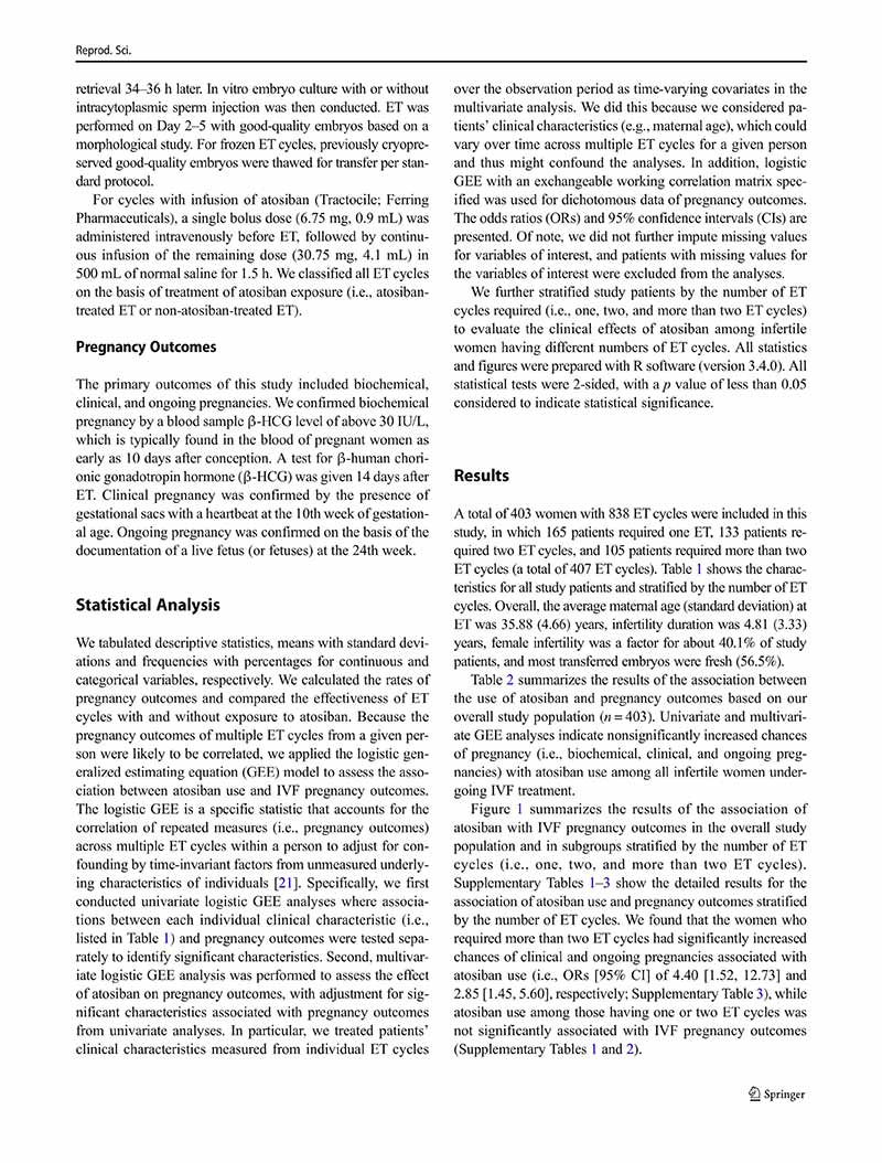 結(jié)論:注射阿托西班是一種潛在的提高體外受精妊娠率的治療方法,特別是在需要兩個(gè)以上胚胎移植周期的不孕婦女中。