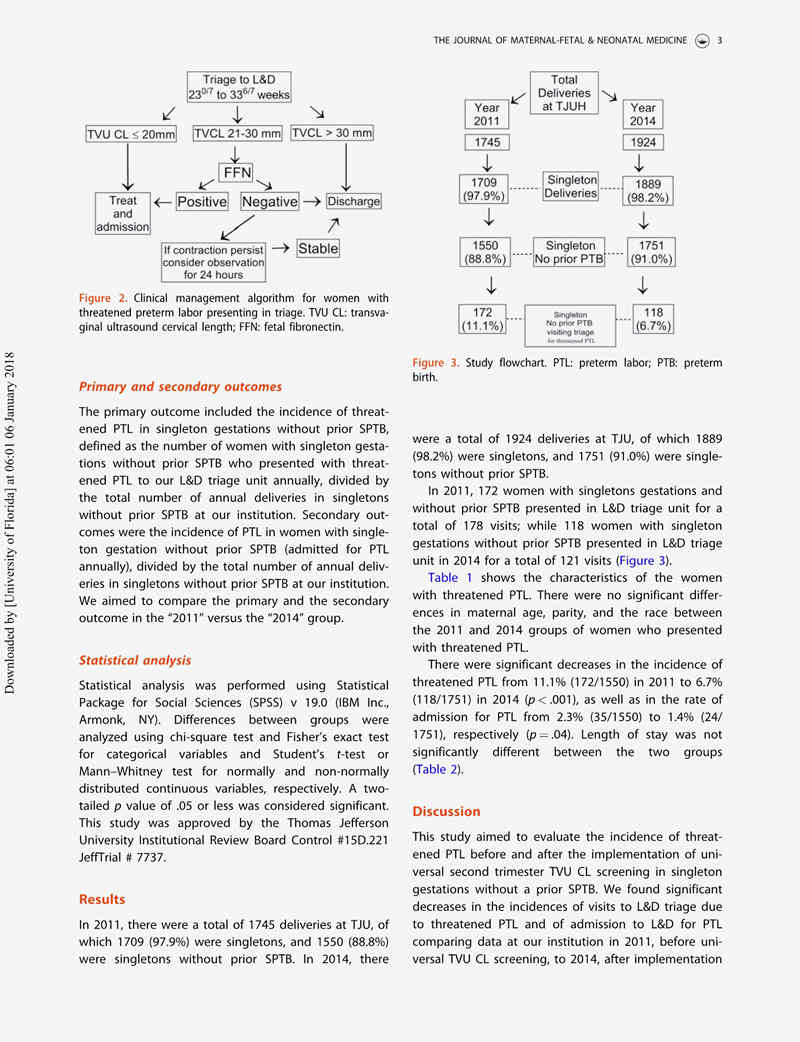 研究設計:這是一項回顧性隊列研究,研究對象是2011年(1月1日至12月31日)和2014年(1月1日至12月31日)因先兆早產(chǎn)在Thomas Jefferson大學醫(yī)院(TJU)(賓夕法尼亞州費城)就診的所有孕23 + 0/7至33 + 6/7周之間且既往無SPTB的單胎妊娠孕婦。自2012年1月1日開始起的兩年中開展TVU
