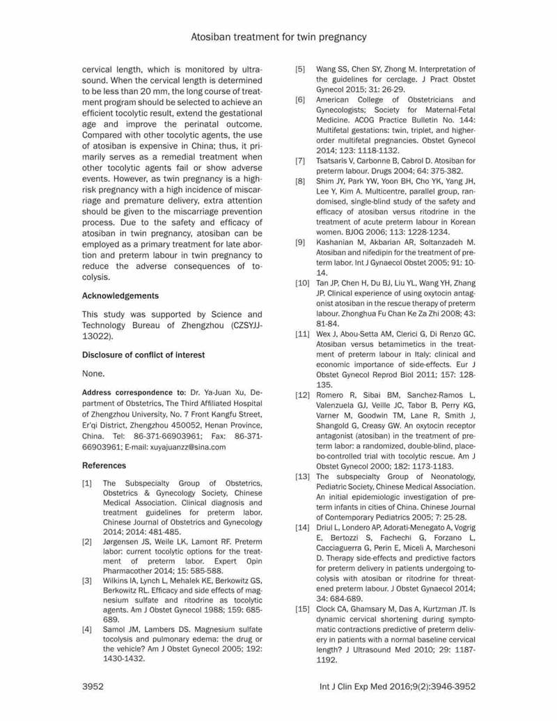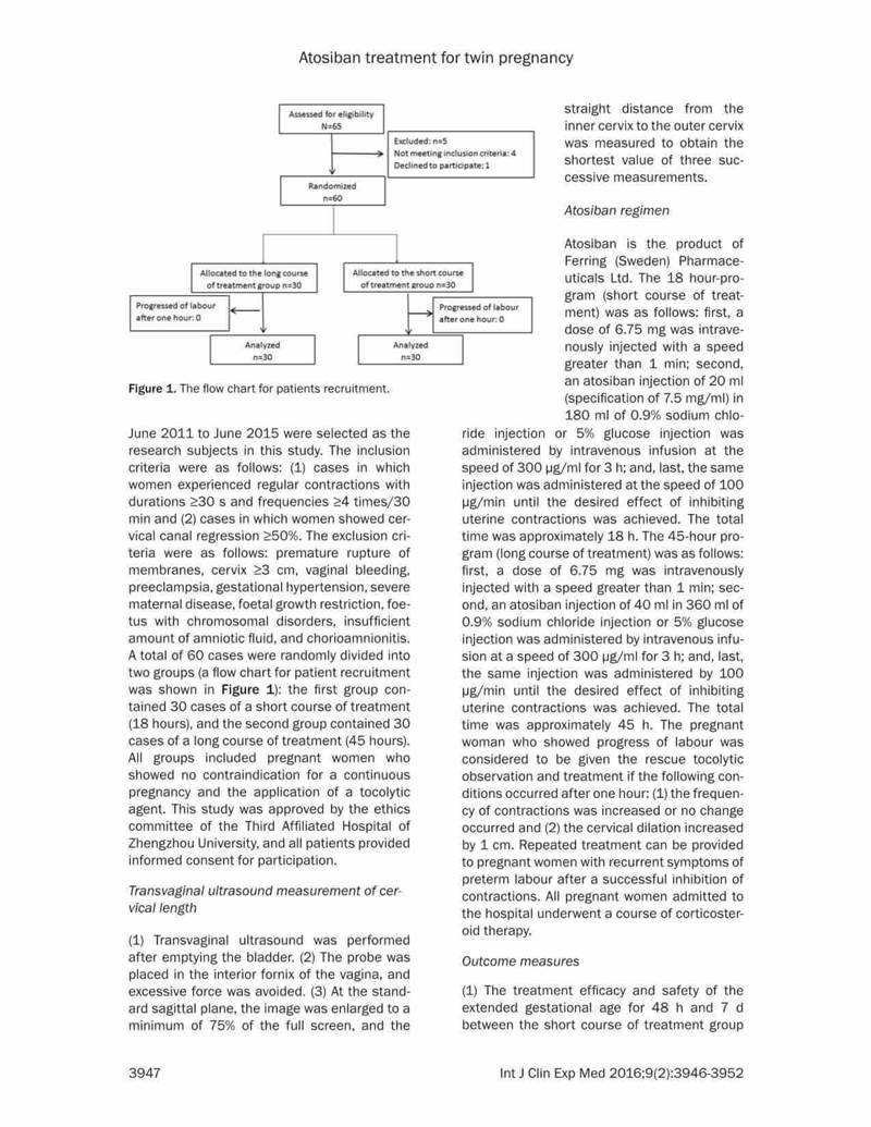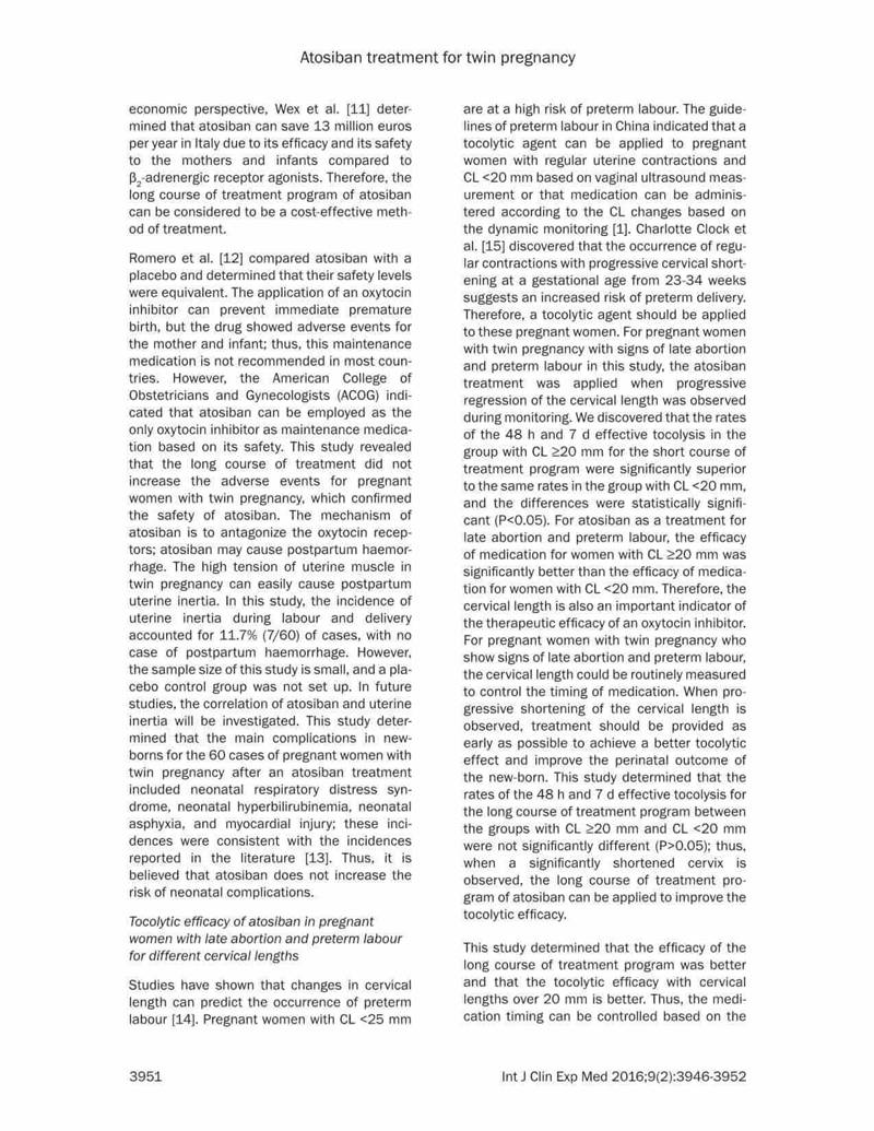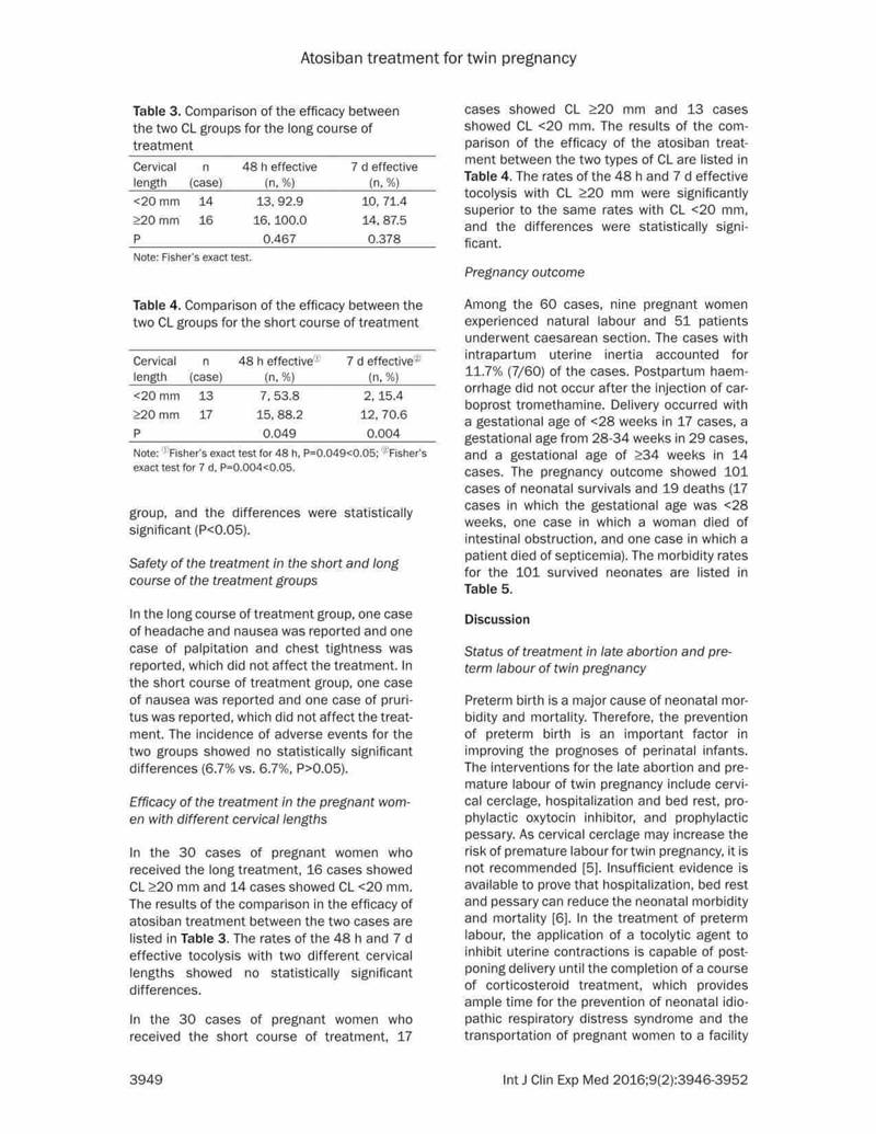 結(jié)論:阿托西班可有效延長晚期流產(chǎn)以及早產(chǎn)的雙胎妊娠的妊娠時間。對于宮頸長度<20mm的病例,長療程治療更有效,效果更好。長期治療不會增加母嬰的不良反應(yīng)。